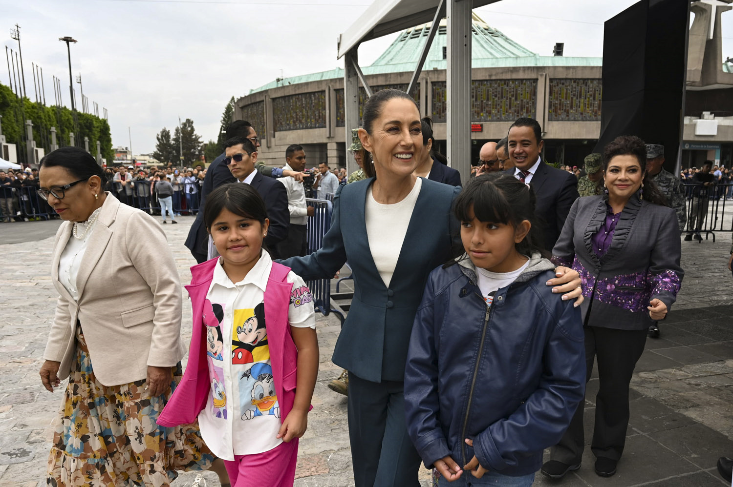 Acompañaron a la presidenta Sheinbaum: la jefa de Gobierno de la Ciudad de México, Clara Brugada Molina; la secretaria de Gobernación, Rosa Icela Rodríguez Velázquez; los secretarios de la Defensa Nacional, Ricardo Trevilla Trejo; y Marina, Raymundo Pedro Morales Ángeles; y la secretaria de Cultura, Claudia Curiel de Icaza.